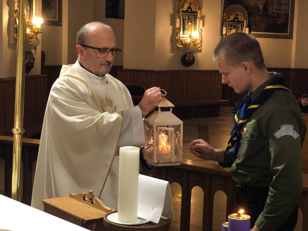 Ostatnie chwile Adwentu, ostatnie roraty. I w tej właśnie chwili, na czas, przybyli do nas harcerze, którzy przynieśli Betlejemskie Światło Pokoju, czyli płomień z groty narodzenia Pana Jezusa z Betlejem.